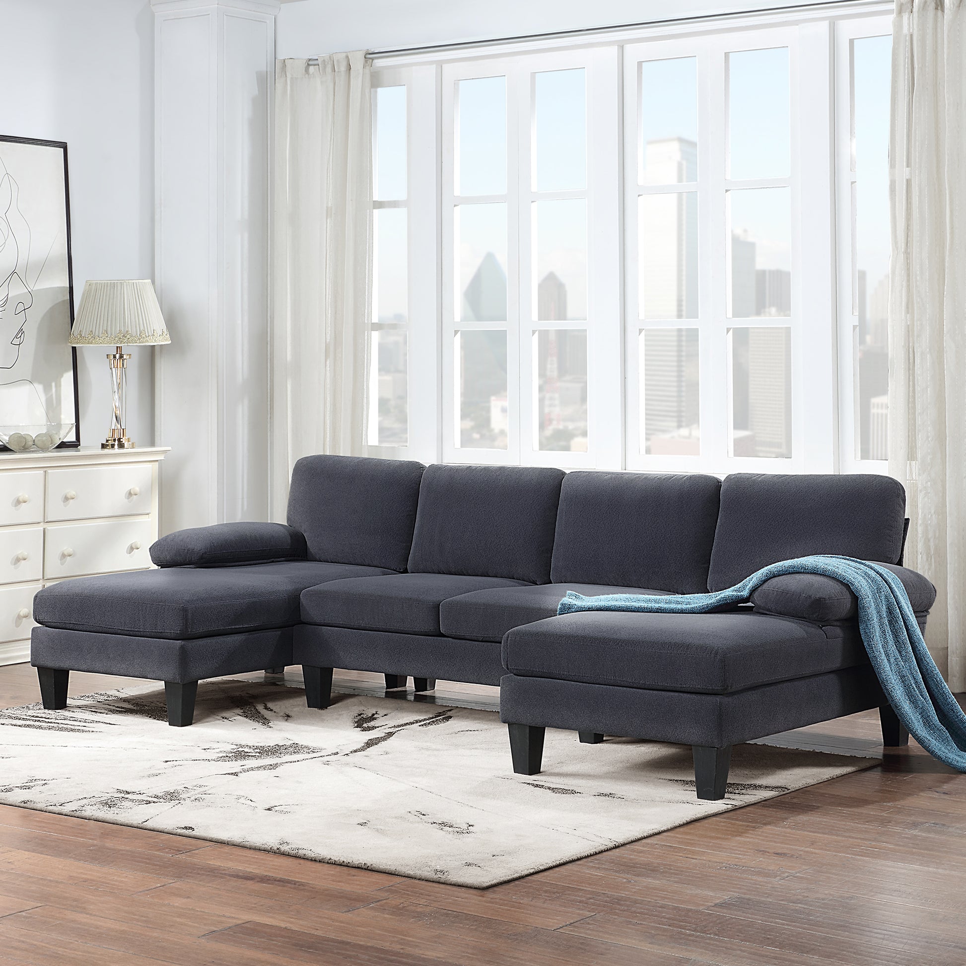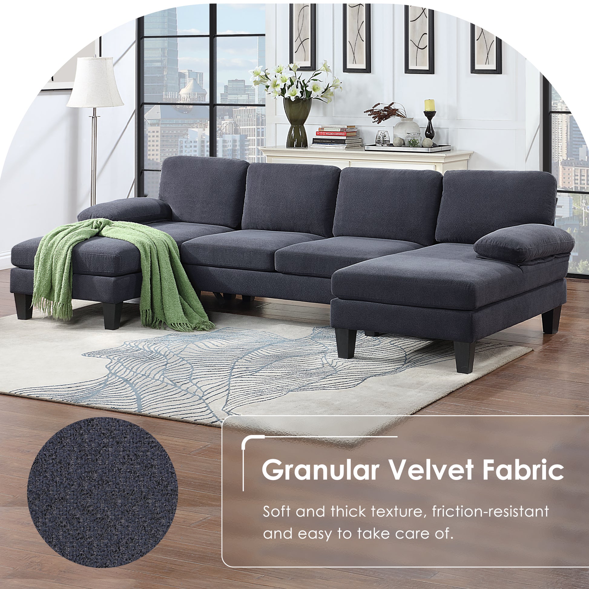 Enhance your living room experience with the PORKISS Double Chaise U-shaped sectional sofa. This elegantly designed sofa, accommodating multiple seating positions, is delicately crafted with high quality granular velvet fabric, ensuring both comfort and durability. The cozy texture adds a warm touch to your interior decor. The wear-resistant and fade-resistant fabric ensures easy cleaning and maintenance, keeping it fresh and vibrant. The sofa also includes armrest pockets on both sides, providing maximum comfort and better support. The sturdy wooden frame of the sofa adds to its longevity and stability, holding up to 330 lbs/seat. This sofa is not only about aesthetics but also functionality, easy to assemble with metal inserts and clear instructions. The PORKISS sectional sofa can also double as a cozy gathering spot for any occasion. Adorn your home with the PORKISS Double Chaise sectional sofa and enjoy the perfect blend of style, durability, and comfort. It's more than just a sofa, it's a statement piece that adds a modern touch to any room.